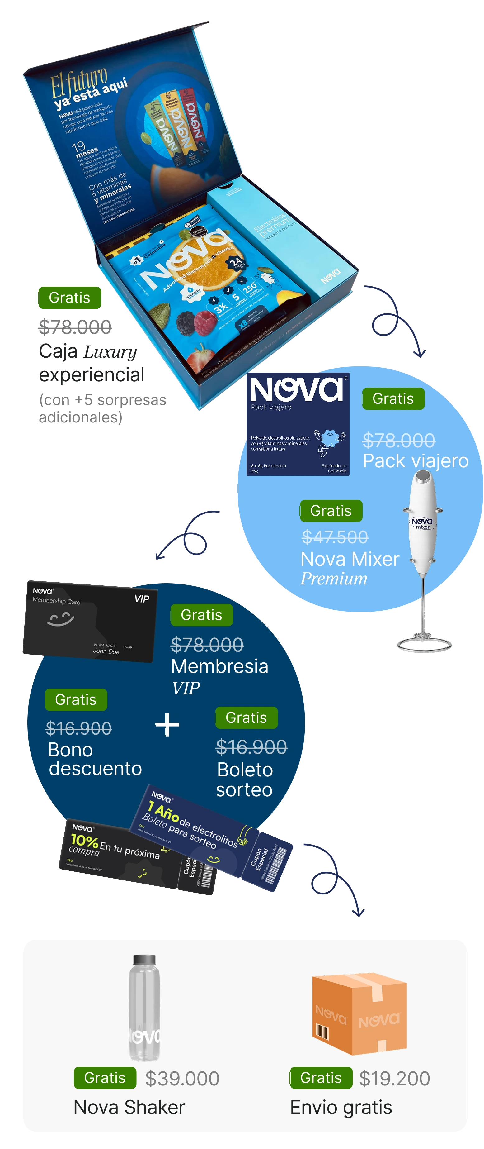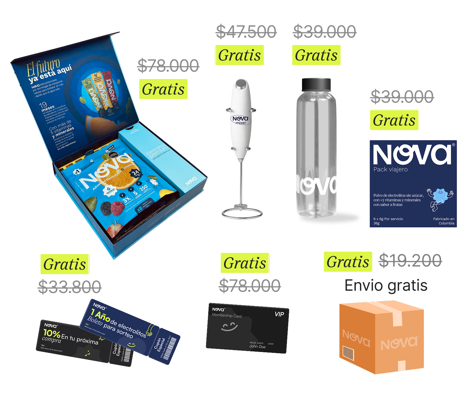 Por la compra de 1 pack de electrolitos Nova. Llévate estos regalos