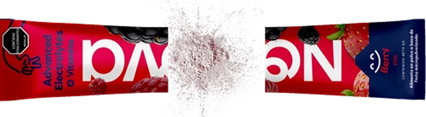 ELECTROLITOS BERRYS: Fresa polvo, Acido cítrico, Cloruro Sodio, Cloruro potasio, Citrato Calcio, Citrato Magnesio, Premezcla Vitaminas (Vitamina B3, Vitamina B5, Vitamina B6, Vitamina B12), Sabor Frutos Rojos, Vitamina C, Lecitina Soya, Dióxido Silicio, Stevia.