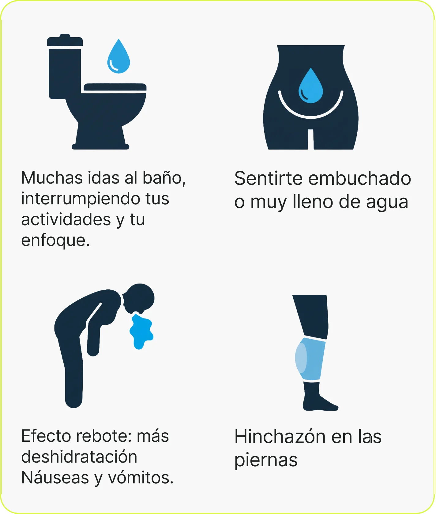 Entre mas cantidad de agua sin electrolitos ni minerales bebas, lo único que vas a lograr es: