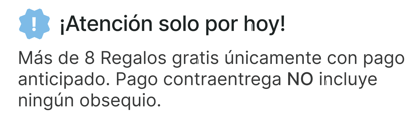 Tú eliges: ofrecemos Pago Contra Entrega (en efectivo) al recibir en casa, o Pago Anticipado (Tarjeta, PSE, Nequi). ¡Ten en cuenta! Los más de 8 Regalos Gratis de la oferta son un beneficio exclusivo para quienes eligen pago anticipado.